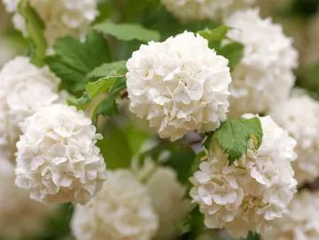 Viburnum x carlcephalum, Zone 3-8, 6-12 H x 6-10 W, apple-green flower clusters turn to snow white balls, easy, fast growing shrub