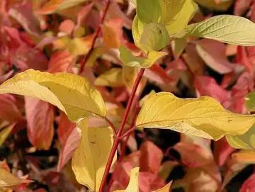 Cornus alba ‘Prairie Fire’, Zone 2-7, very hardy and colorful accent shrub, brilliant red fall foliage drops to reveal flaming orange-red stems for winter contrast