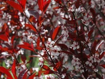Prunus x cistena, Zone 2-8, striking foliage and delicate looking flowers, tolerates most well-drained soils