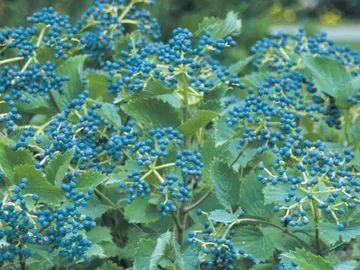 Viburnum dentatum ‘Blue Muffin’, Zone 3-8, 6 H x 6 W, balls of creamy white flowers turn to azure blue berries in late fall, shade tolerant