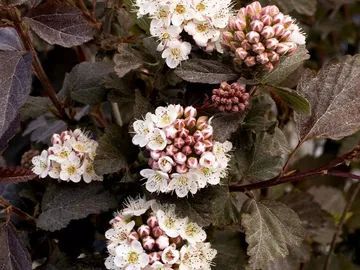 Physocarpus opulifolius ‘Monlo’, Zone 3-7, stunning deep purple foliage, creamy white flowers, prefers acidic soils, tolerates some drought