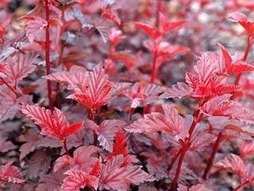 Physocarpus opulifolius 'Center Glow', Zone 2-8, 4-6 H x 4-6 W, yellowish green new foliage matures to orangish glow, and dark red with purple hues in fall, pink flowers in early summer