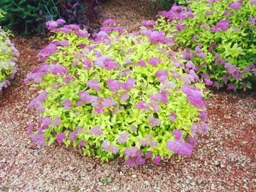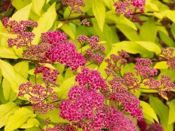 Spiraea japonica 'Goldmound', Zone 4-8, Vibrant golden spring foliage, pink flowers, yellowish green in summer foliage then rich, yellowish orange in fall