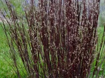 Panicum virgatum ‘Heavy Metal’, Zone 4-8, Full sun, blue grey leaf blades turn yellow in fall, loose weeping purple green heads rise above foliage